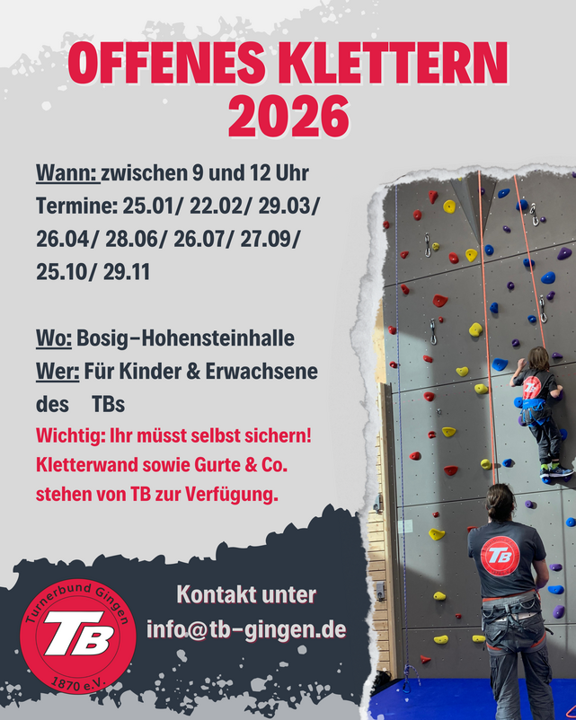 Mit einem Programm aus Klettertraining sowie Koordinations-, Gleichgewichts- und Konzentrationsübungen sorgen wir für ein abwechslungsreiches Angebot bei dem auch der Spaß nicht zu kurz kommt. Du möchtest regelmäßig beim TB Klettern und hast Interesse deine Klettertechnik zu verbessern? Dann melde dich bitte unter info@tb-gingen.de an. Da die Anfrage groß ist, ist eine Anmeldung zum Klettern unbedingt nötig.